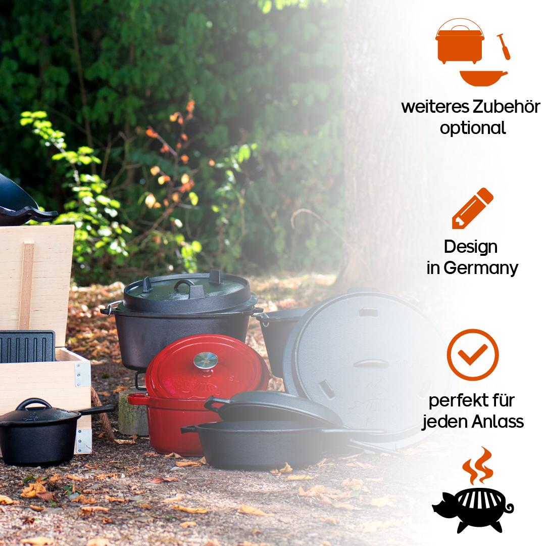 Der Grillschweine Dutch Oven ist ein gusseiserner Topf mit Deckel, der großer Hitze ausgesetzt werden kann. Somit kann er nicht nur in der Küche zum Einsatz kommen, sondern auch beim Grillen dem Feuer ausgesetzt werden. Auch das Schichten von Glut auf dem Deckel, womit eine rundherum stabile Hitze erzeugt wird, ermöglicht eine schnelle und doch schonende Zubereitung des Essens.