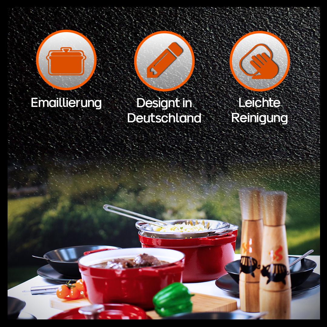 Mit dem Grillschweine Dutch Oven Emailliert 5L ist das Kochen und Backen, das Schmoren und Grillen, keine Herausforderung mehr und jeder kann hiermit im Handumdrehen leckere Gerichte zubereiten. Und dank der einfachen Handhabung und der unproblematischen Reinigung gibt es auch beim Abwasch kein böses Erwachen. So ist der Dutch Oven die perfekte Ergänzung für Kochprofis wie auch Kochanfänger.
